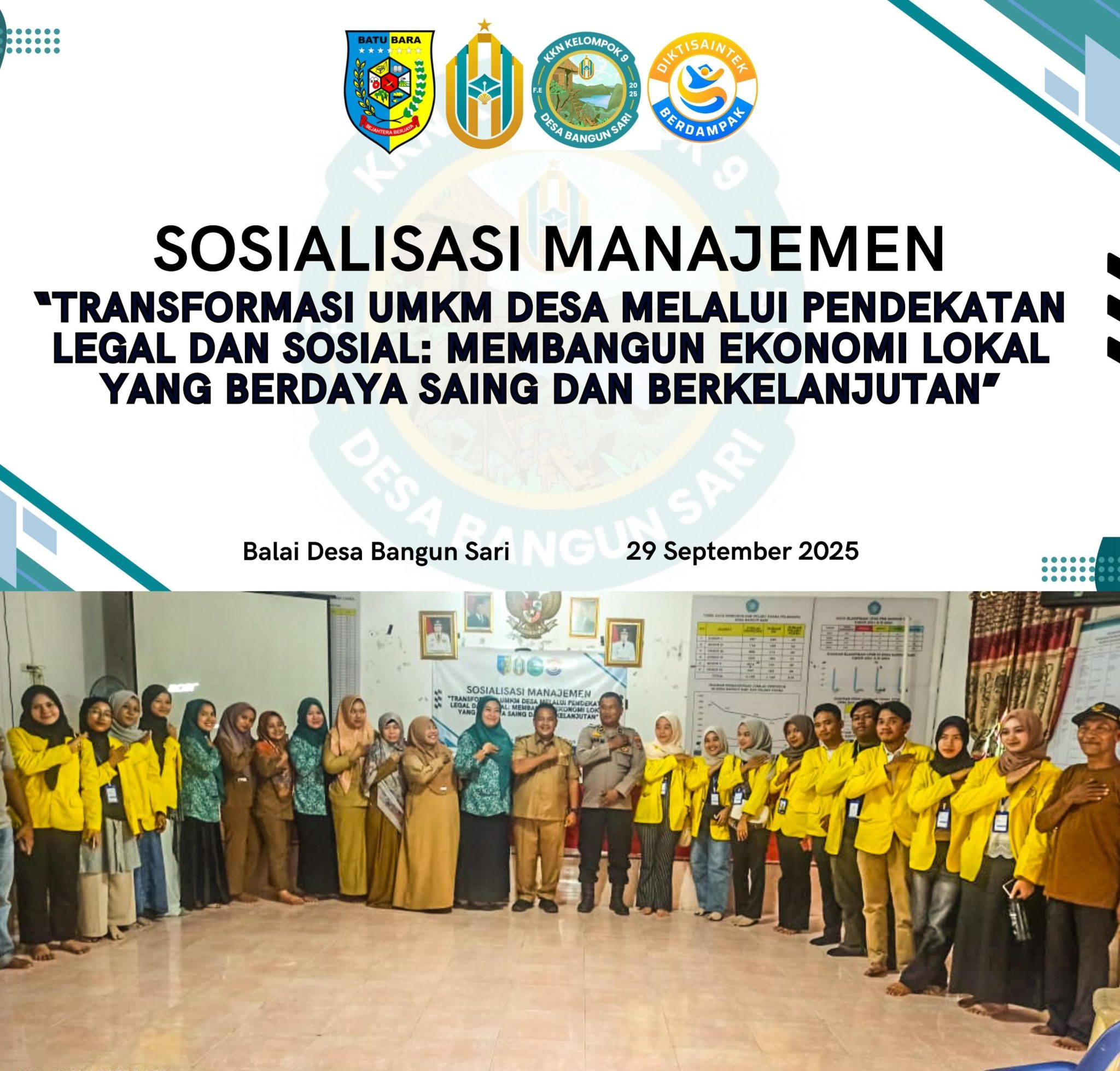 Dalam semangat membangun desa yang mandiri dan berdaya saing, mahasiswa KKN Kelompok 9 Fakultas Ekonomi Universitas Asahan berkolaborasi dengan Polsek Labuhan Ruku dan Pemerintah Desa Bangun Sari menyelenggarakan sosialisasi bertajuk “Transformasi UMKM Desa melalui Pendekatan Legal dan Sosial”. Kegiatan yang digelar di Balai Desa Bangun Sari pada Senin, 29 September 2025 ini menjadi langkah nyata dalam memperkuat pondasi hukum dan sosial para pelaku usaha mikro, kecil, dan menengah (UMKM) setempat.